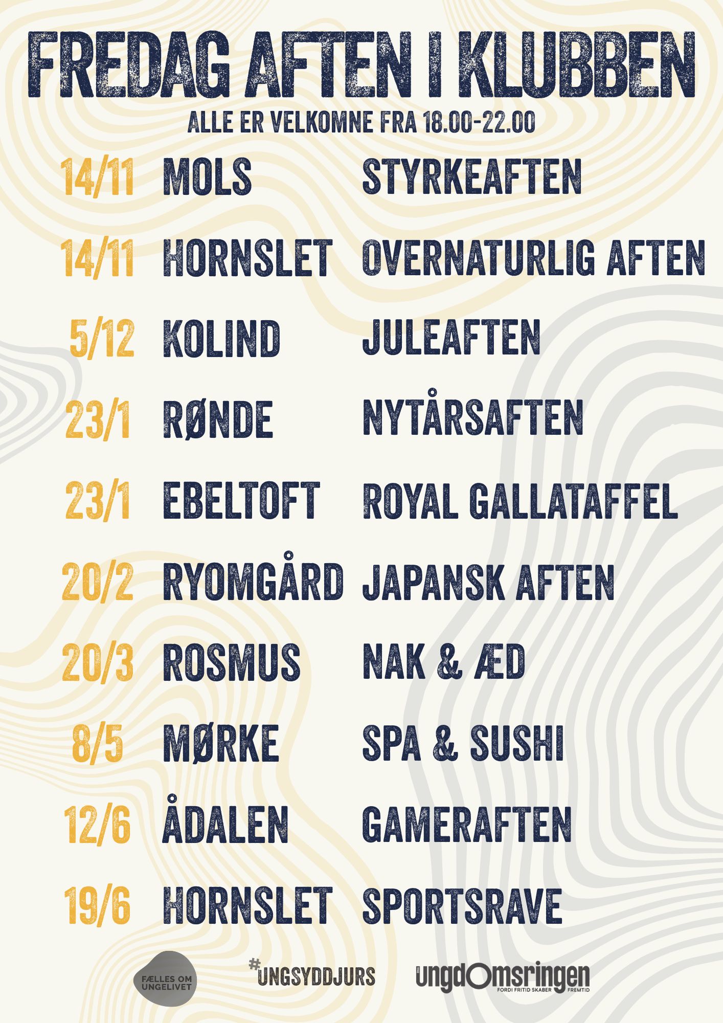 5/12 - Kolind JULEAFTEN Kom og vær med til en hyggelig juleaften i klubben fuld af sjov, musik og god stemning! Glæd dig til: Sprøde flæskestegsburgere Julemusikquiz Fede præmier i pak pakken ud Kæmpe hoppeborg Kom som du er - julestemning påkrævet! Praktisk: Maarupvej 3, 8560 Kolind. Tlf: 60 12 39 02 Se hvornår din klub har åben til fredag aften i klubben nedenfor: