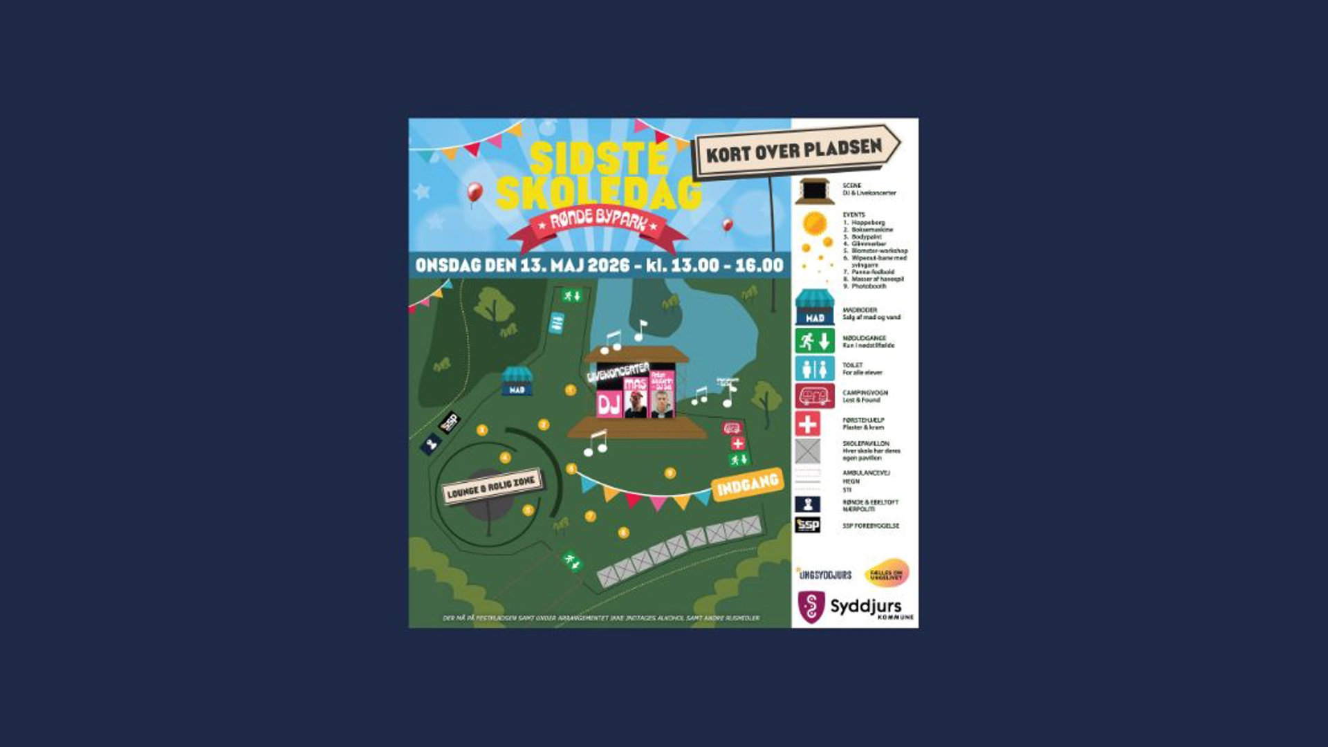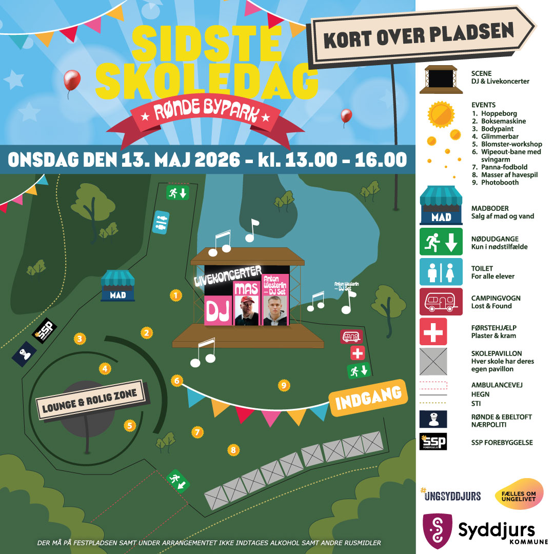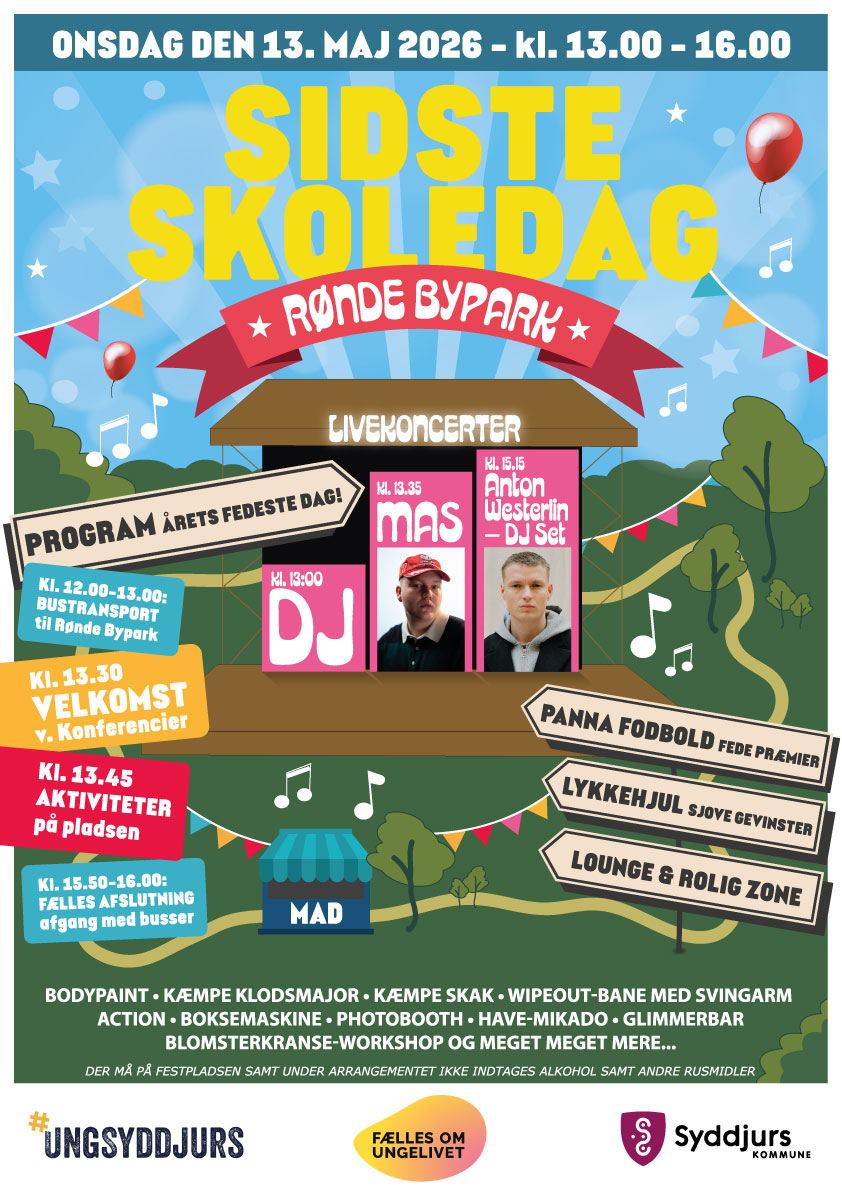 Arrangementet afholdes af Syddjurs Ungdomsskole i samarbejde med Syddjurs Kommune og Fælles om Ungelivet og er en festlig, tryg og alkoholfri afslutning på skoleåret for de unge. Dagen er en del af Byrådets budgetaftale for 2026, hvor samtlige partier er enige om, at der skal afvikles en fælles sidste skoledag uden alkohol.